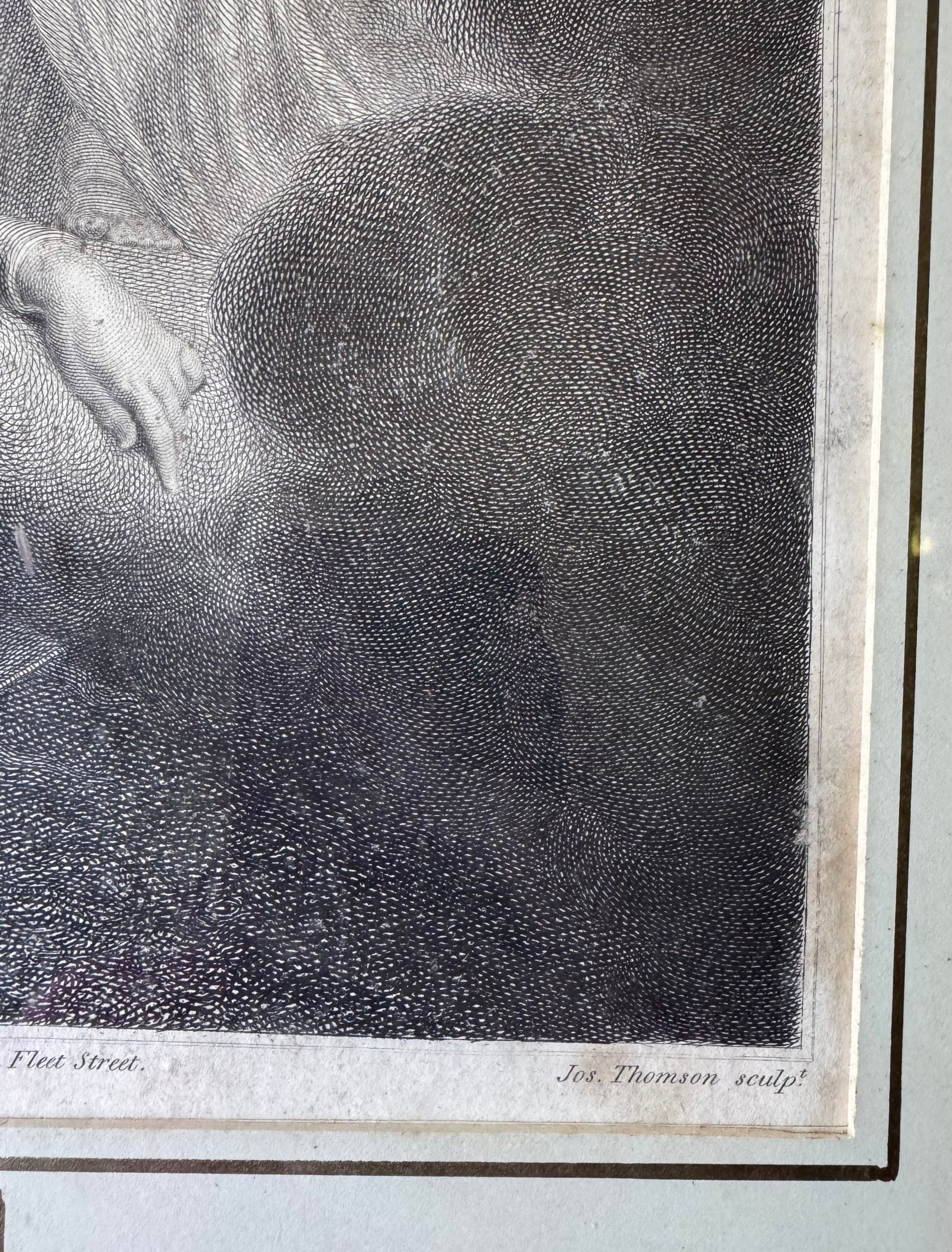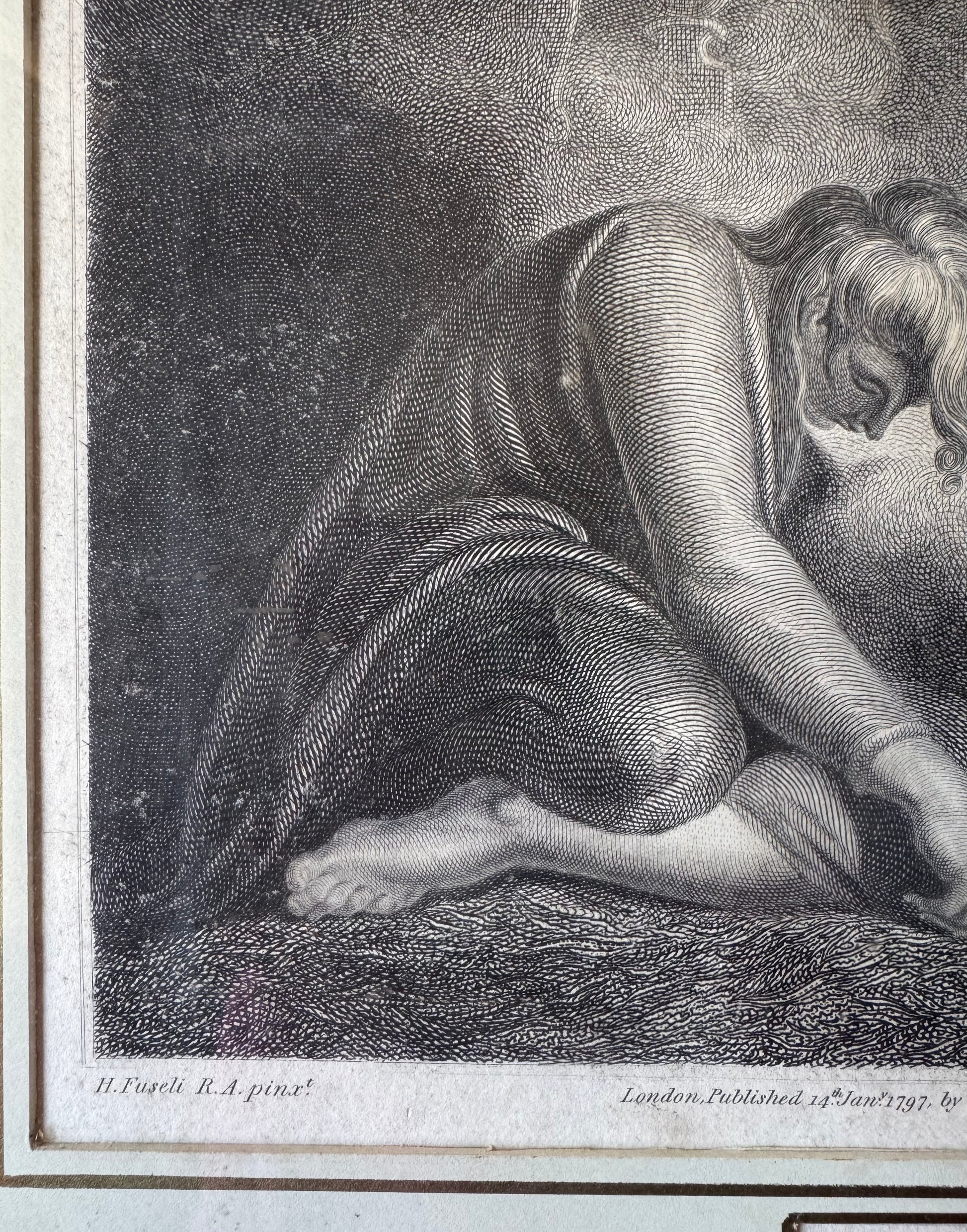 Engraved by Josiah Thompson (fl. 1780“1800), the artwork exemplifies Fuselis dramatic aesthetic, featuring an ethereal female figure draped in flowing robes, seemingly conjuring a celestial vision. The Apostle John, overwhelmed, lies in a state of awe, his outstretched arm leading the viewers eye towards a mysterious book perhaps a reference to the Book of Revelation. The fine cross-hatching technique enhances the depth and chiaroscuro, hallmarks of Fuseli’s theatrical compositions.