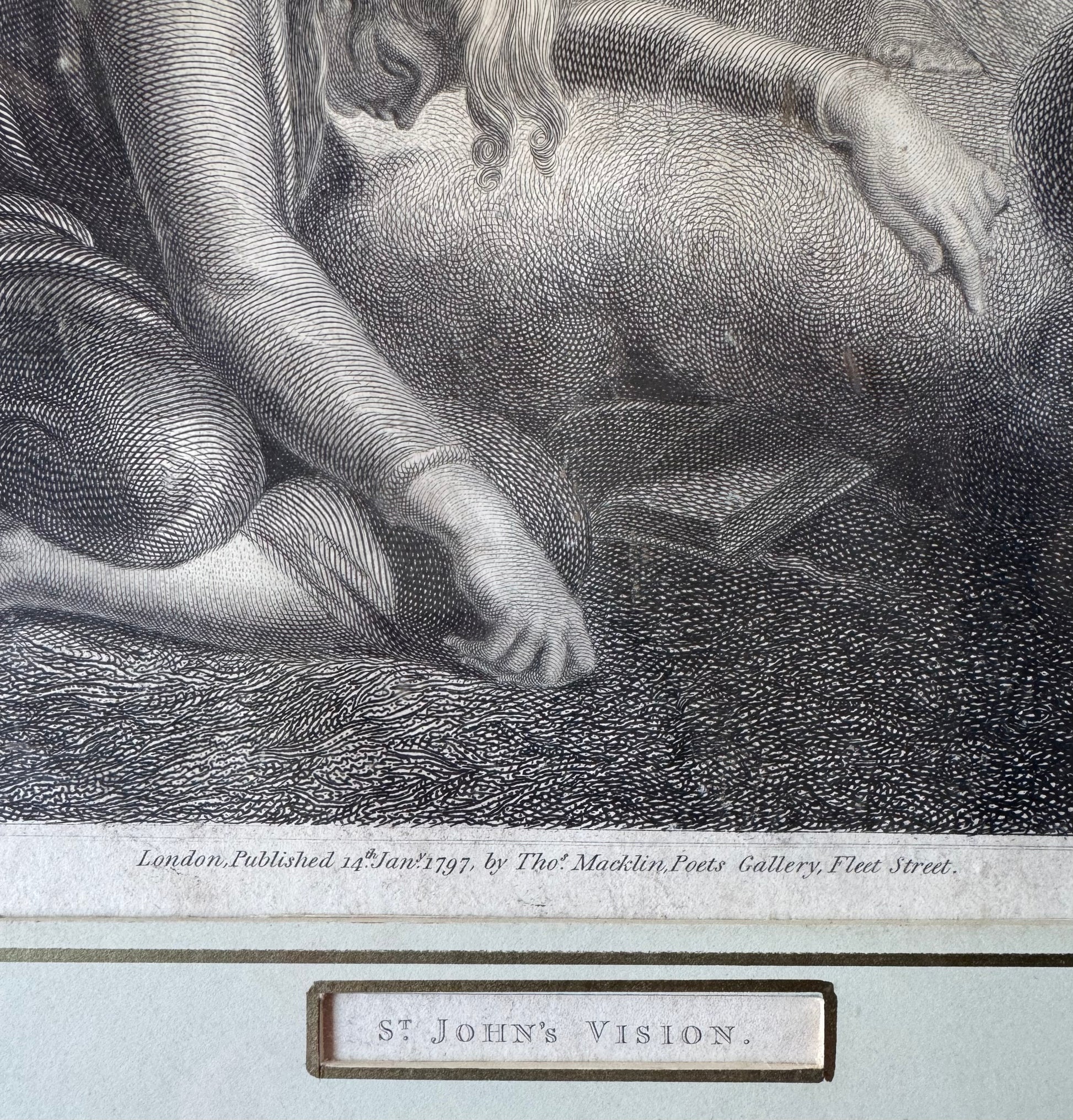 This striking 18th-century engraving, St. John’s Vision, was published on 14 January 1797 by Thomas Macklin’s Poets’ Gallery, Fleet Street, London. Based on an original painting by the renowned Henry Fuseli RA (1741-1825), the scene captures a moment of divine revelation experienced by St. John the Evangelist, blending Romantic intensity with visionary grandeur.